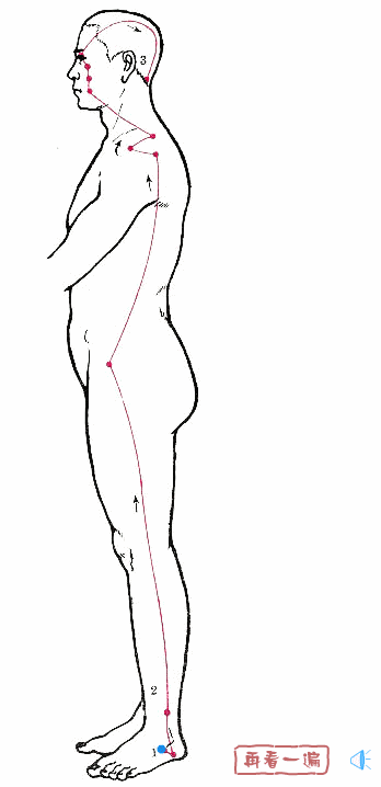 第三支,与足太阳膀胱经同起子眼内角,上行至前额,于巅顶交会,人络于脑,再别出下项,沿肩胛骨内,脊柱两旁,到达腰中,进入脊柱两侧的肌肉,与肾脏相联络。