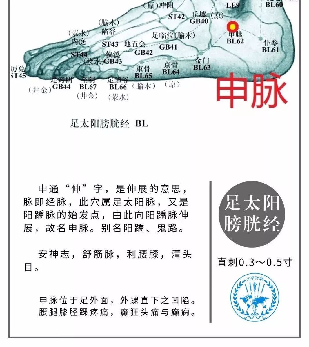 申脉穴也称阳跷穴,属足太阳膀胱经。八脉交会穴之一,通阳跷。有补阳益气、疏导水湿之功效。