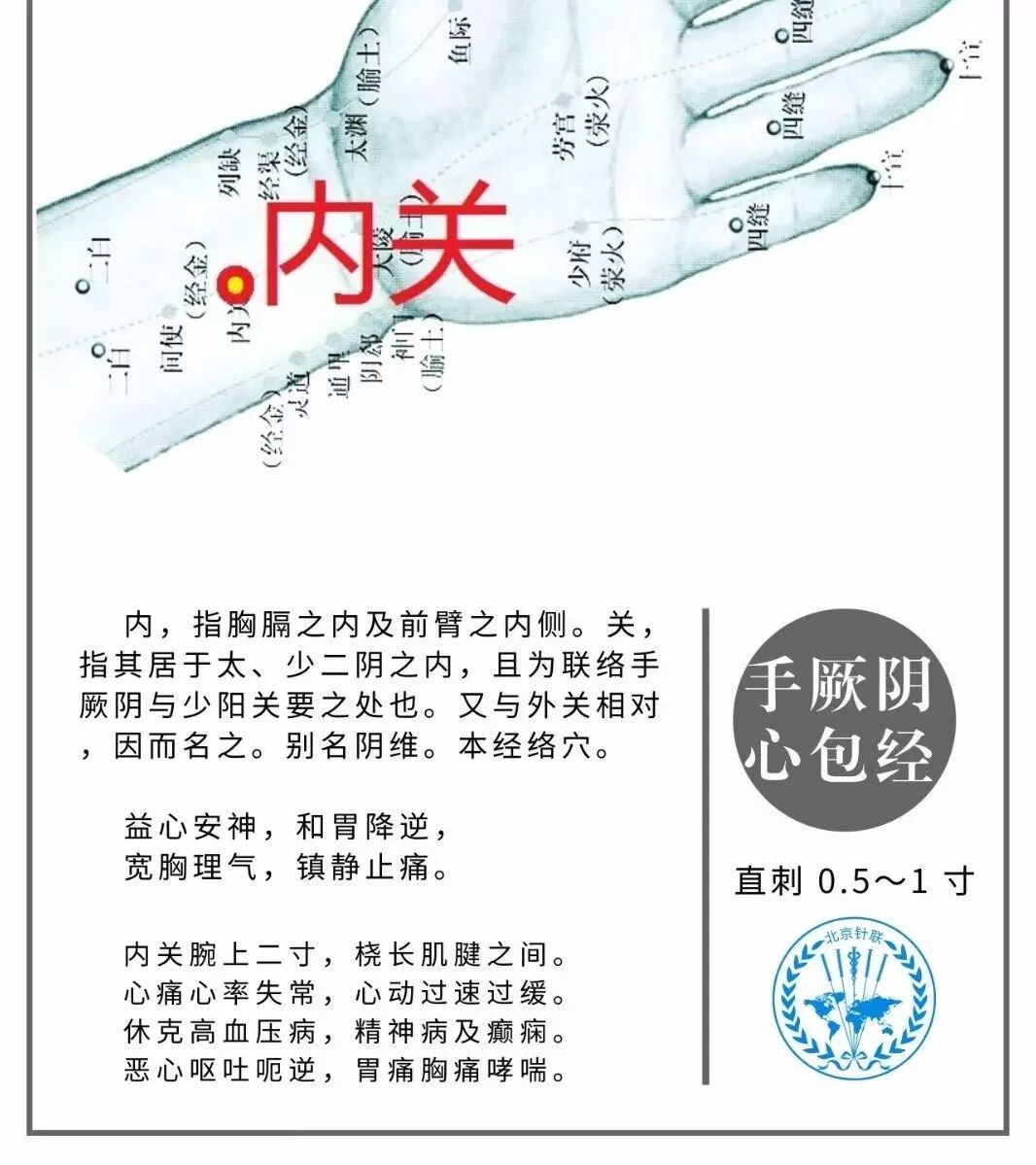主治本经经病和胃、心、心包络疾患以及与情志失和、气机阻滞有关的脏腑器官、肢体病变,广泛应用于临床。有宁心安神、理气止痛之功。直刺或向上斜刺 0.5~1 寸。