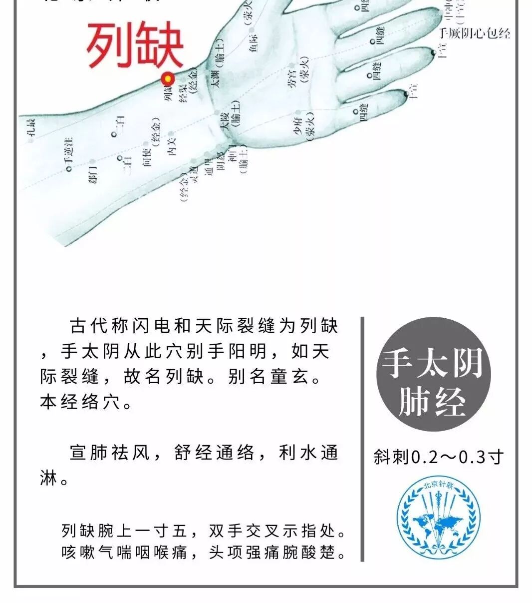 有宣肺解表,通经活络,通调任脉的作用;临床上主要用于配合治疗咳嗽、气喘、头痛,尿血等病症。向肘斜刺 0.2~0.3 寸,平刺 0.5 ~ 1 寸 。