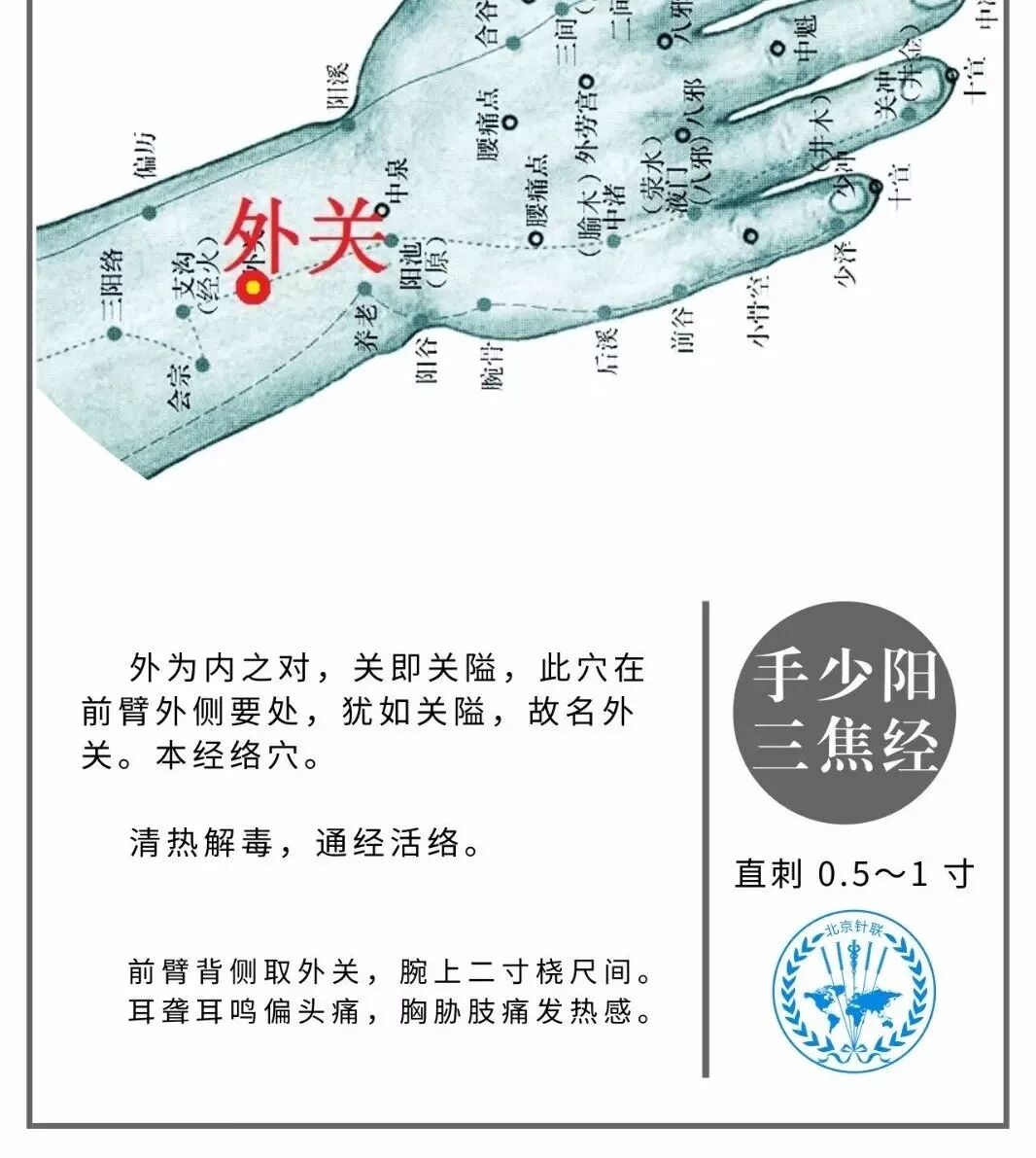 外关穴为手少阳之络,八脉交会穴之一。通阳维脉三焦经。有清热解毒、解痉止痛、通经活络之功。