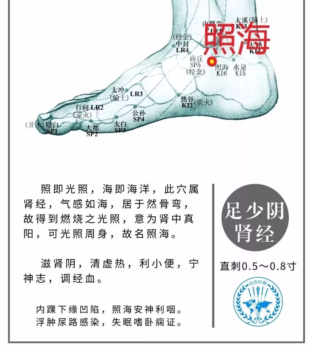 主治咽喉干燥,痫证,失眠,嗜卧,惊恐不宁,目赤肿痛,月经不调,痛经,赤白带下,阴挺,阴痒,疝气,小便频数,不寐,脚气。